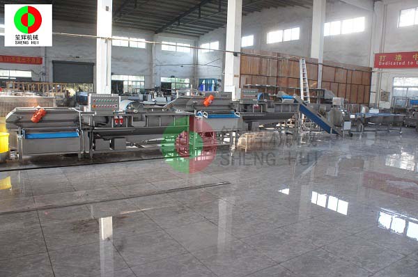 其中一條生產(chǎn)線是(氣泡洗菜機(jī)預(yù)浸泡--6人分選--切割--提升--純氧源高濃臭氧混合渦流洗菜機(jī)清洗--紅外線殺毒和預(yù)制冷保鮮二級渦流洗菜機(jī)清洗--脫水)。