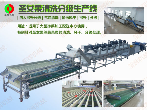 圣女果生產(chǎn)線,當(dāng)中有對(duì)果體進(jìn)行清洗的步驟,采用氣泡清洗,清洗分離被清洗物表面附著物,模擬人工清洗基本動(dòng)作并盡量減少了人工清洗中的碰、磕、劃傷等現(xiàn)象,提 高了工作效率,變?nèi)斯ぷ鳂I(yè)為機(jī)械化加工。適合于各種新鮮蔬菜、鹽漬菜、菌類、海產(chǎn)品。根據(jù)所清洗物料比重的不同,設(shè)計(jì)了兩種型號(hào):全 網(wǎng)帶型、半網(wǎng)帶型。半網(wǎng)帶型適合于物料比重小于或等于水的物料,全 網(wǎng)帶型適合比重大于水或怕碰傷的物料。