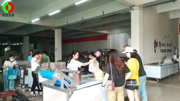 客戶新臨我司考察,測試蔬果切割清洗等設(shè)備!某企業(yè)公司經(jīng)理帶領(lǐng)一行人親臨我司進行考察,測試蔬果切割清洗等一批設(shè)備。