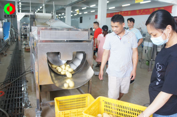 連續(xù)式土豆去皮機(jī)針對(duì)客戶帶來(lái)的大批土豆現(xiàn)場(chǎng)進(jìn)行加工處理測(cè)試!