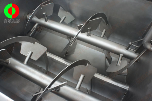 1、采用平行雙軸結(jié)構(gòu),攪拌軸上裝有斜板式槳葉及螺旋推進(jìn)攪拌圈,物料在料斗中翻動(dòng)的同時(shí)作旋轉(zhuǎn)運(yùn)動(dòng),使各種物料攪拌的更加均 勻,使之達(dá)到較佳混料效果;